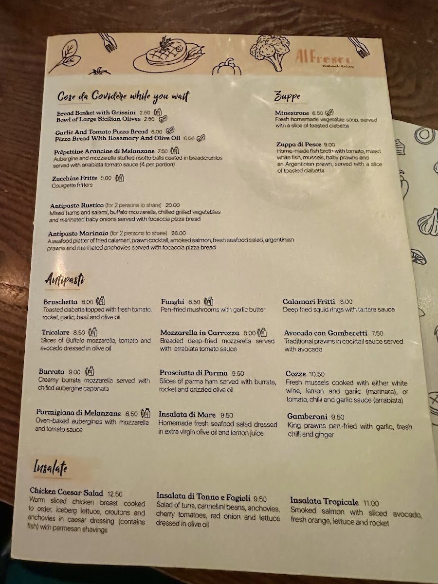 Welcome to Al Fresco - Whetstone, where our enticing menu is a celebration of authentic Italian cuisine, crafted to delight your palate. Nestled in the heart of London at 1327 High Rd, N20 9HR, we invite you to indulge in our standout dishes such as the rich and savory Spaghetti Allo Scoglio, the comforting Pollo E Pane, and the classic Spaghetti Carbonara, guaranteed to transport you straight to Italy with every bite. Don’t miss our fresh Grilled Salmon and hearty Fritto Misto for a taste of the sea, or treat yourself to our delightful Tiramisù that’s perfect for dessert. With an array of culinary masterpieces like our Seafood Risotto and Tagliatelle Al Gambero E Zucchine, your dining experience will be nothing short of extraordinary. Join us for a meal and savor the Italian flavors that make Al Fresco - Whetstone a must-visit!